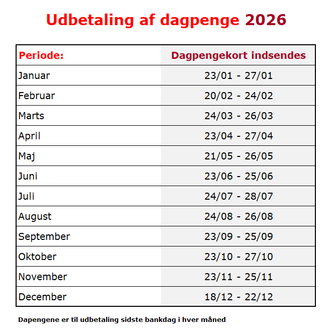 Her står alle datoer for hvornår du kan (og senest skal) indsende dit dagpengekort, måned for måned i hele 2026.